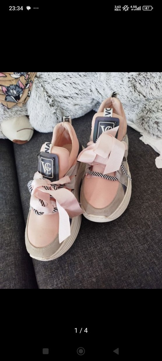 Pastel pembe renkte, baskılı detaylara ve fiyonk süslemeye sahip platform spor ayakkabılar, kauçuk malzemeden üretilmiştir. Alış fiyatının çok altında satıyorum toplasanız 2 kere anca giyilmiştir