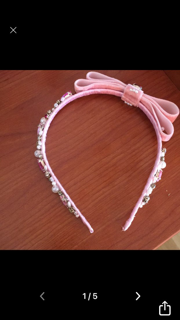 Pembe renkte kadife kurdele üzerinde , inciler ve kristallerle süslenmiş fiyonklu taç. Bohem tarzı için uygundur.