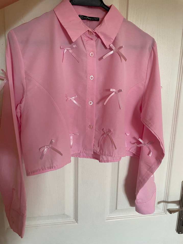 Sevimli pembe rengi ve pembe fiyonk detaylarıyla tarzınıza tatlı bir dokunuş katıyor. Crop kesimi sayesinde yaz kombinlerinizin vazgeçilmezi olacak. Hiç kullanılmamış, yepyeni! ✨