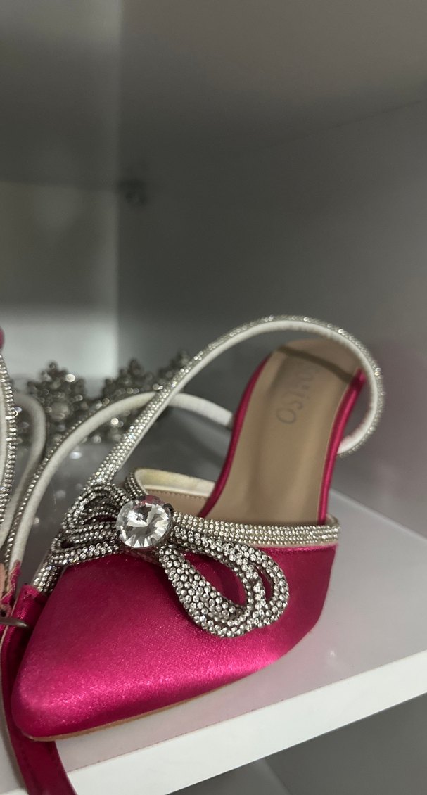 Parlak pembe sentetik kumaştan, işlemeli desenli ve kristal süslemeli fiyonk detaylı kadın abiye yüksek topuklu ayakkabı, düğünler için uygun.