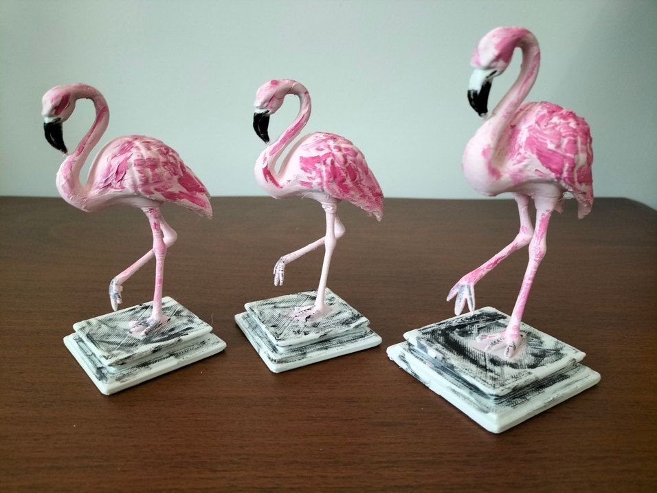 Pastel pembe flamingo biblo, kuşun zarif duruşunu ve ince detaylarını yansıtan dokulu bir taban üzerinde duruyor. Şirin bir dekoratif parça .