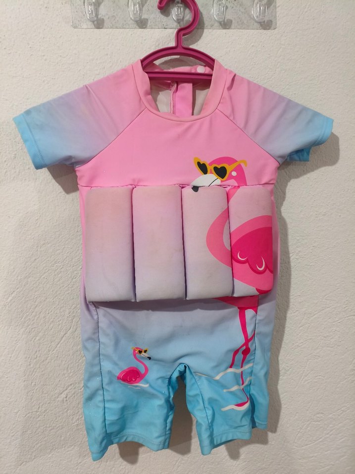 Pastel pembe ve mavi renkte, flamingo desenli kısa kollu çocuk yüzme seti, yumuşak ve rahat kumaştan yapılmıştır.