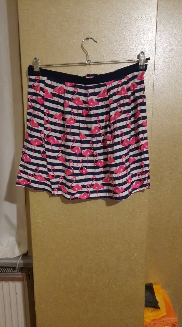 Sentetik kumaştan, pilili ve normal boyda, pembe flamingo desenli, çizgili, bol kesim kısa etek. Günlük sokak tarzına uygun. Eni 40 Boyu 42 cm dir. Penye değil.