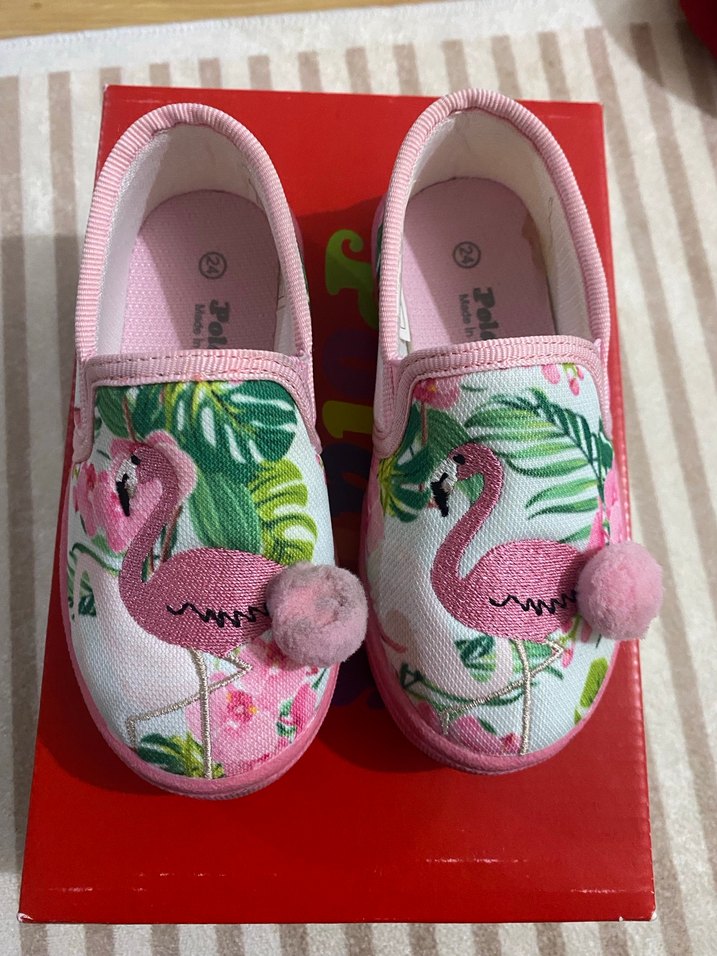 Pembe flamingo desenli kız ayakkabı , yumuşak ponpon detaylıdır. Kauçuk tabanlı ve cırt cırtlı, günlük rahat kullanım için uygundur.