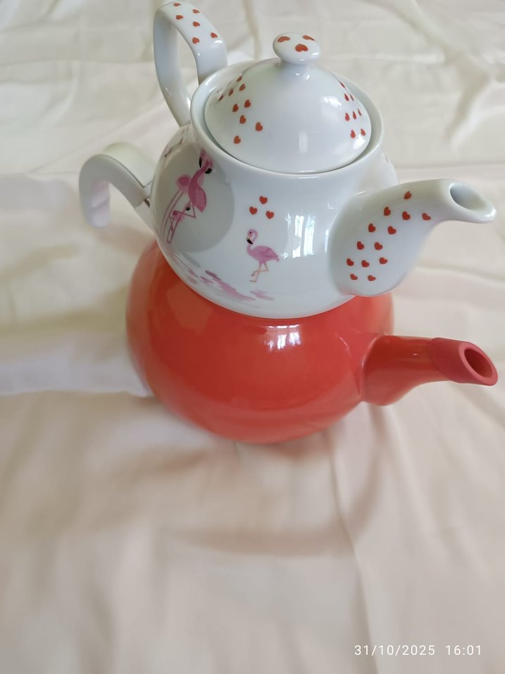 Karaca Pembe tabanlı, beyaz üst kısmı flamingo ve kalp desenleriyle süslü renkli çaydanlık.