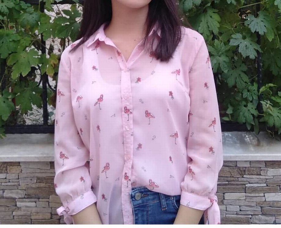 Pembe flamingo desenli, uzun kollu, yakalı ve düğmeli, kadın gömleği. Günlük rahat kullanıma uygundur. Hızlı kargo.
