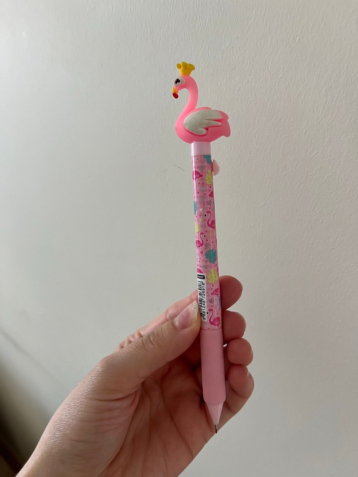 Pembe desenli flamingo figürlü 0.7 uçlu kalem. Uzun süre kullanıldı temiz ve sağlam sorunu yok. Flamingo altındaki küçük yerden ucu açıp kapatabiliyorsunuz.