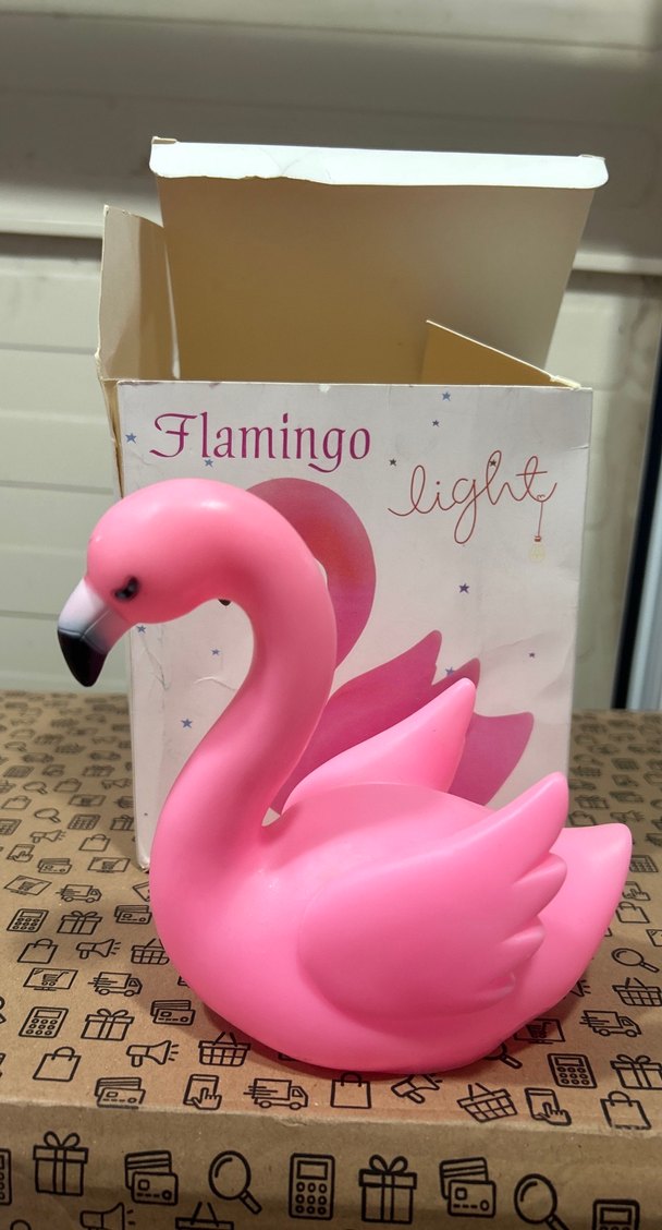 Pembe flamingo şekilli masa lambası, yumuşak bir ışık yayarak ortama nazikçe aydınlık katıyor. Eğlenceli tasarımıyla dekoratif bir parça.
