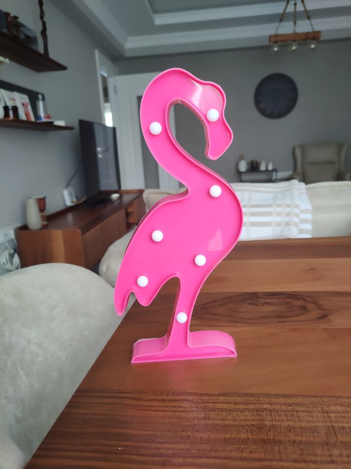 Pembe flamingo şeklinde masa lambası, renkli LED ampulleriyle odalara eğlenceli bir hava katar. Düz tabanı sayesinde dengelidir.