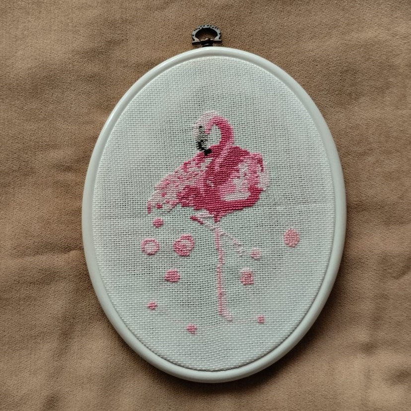 El işleme.Beyaz kumaş üzerine pastel pembe flamingo nakışıyla oval çerçeve, zarif detaylar ve yumuşak renkler içerir. Duvar dekoru için uygundur.