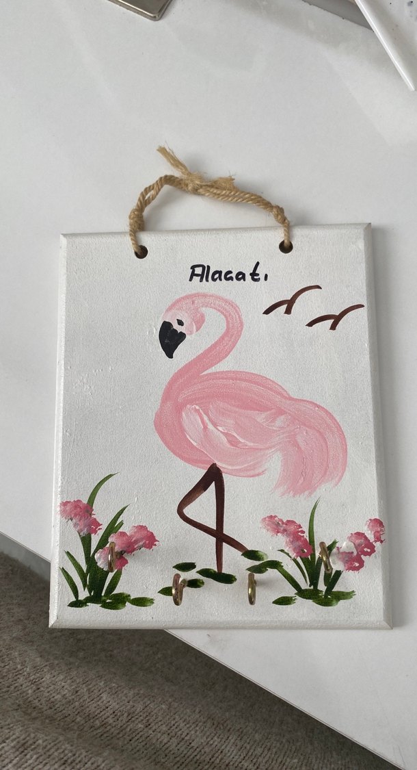 Pastel pembe flamingo figürlü, çiçekler ve uçan kuşlar detaylı dekoratif tablo. "Alacati" yazısı ve askı kancaları bulunur.