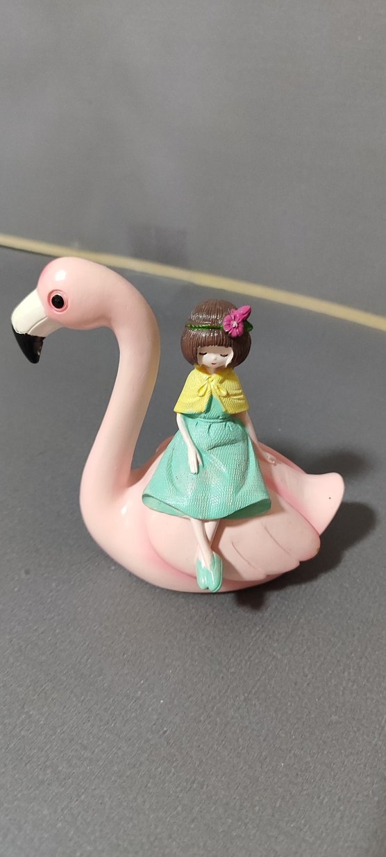 Pastel pembe flamingo figürünün üzerinde, turkuaz elbiseli, sarı pelerinli ve saçında çiçek olan küçük bir kız oturuyor.