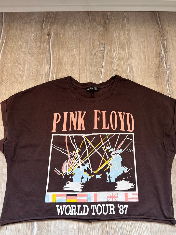Kahverengi pamuklu, kısa kollu, bisiklet yaka, bol kesim kadın tişört. Pembe Floyd World Tour '87 baskılı, rock punk parti havasına uygun.