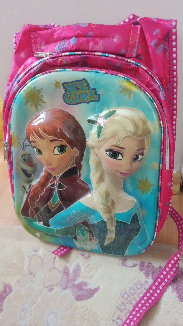 Renkli pembe okul çantası, Frozen karakterleri ve sağlam ön bölmesi ile ayarlanabilir askılara sahiptir. ❄️