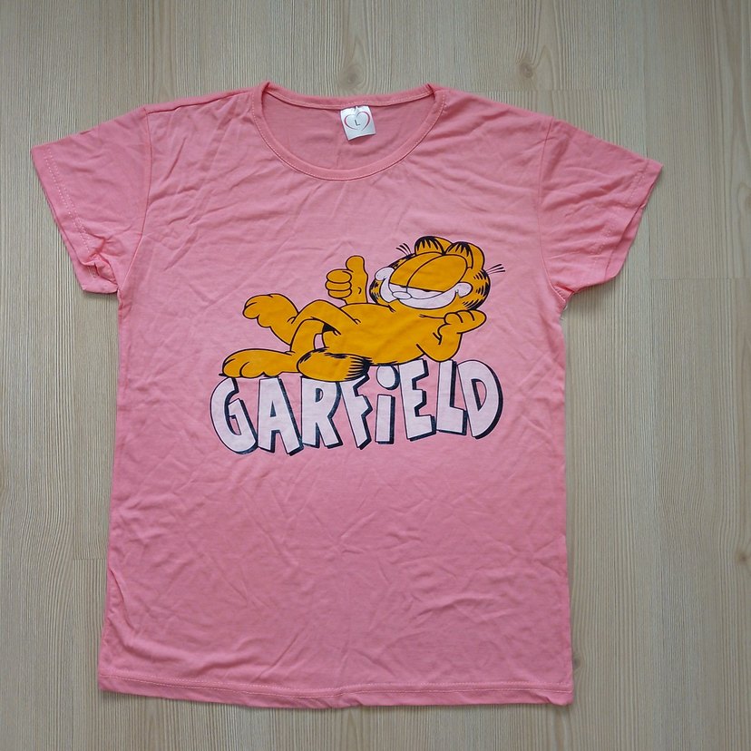 Pembe renkli, bol kesim kız tişörtü. Kısa kollu, yuvarlak yaka ve renkli Garfield baskılıdır. L beden sıfır üründür hiç kullanılmadı. Boy 60 cm iki kol arası 47 cm dir