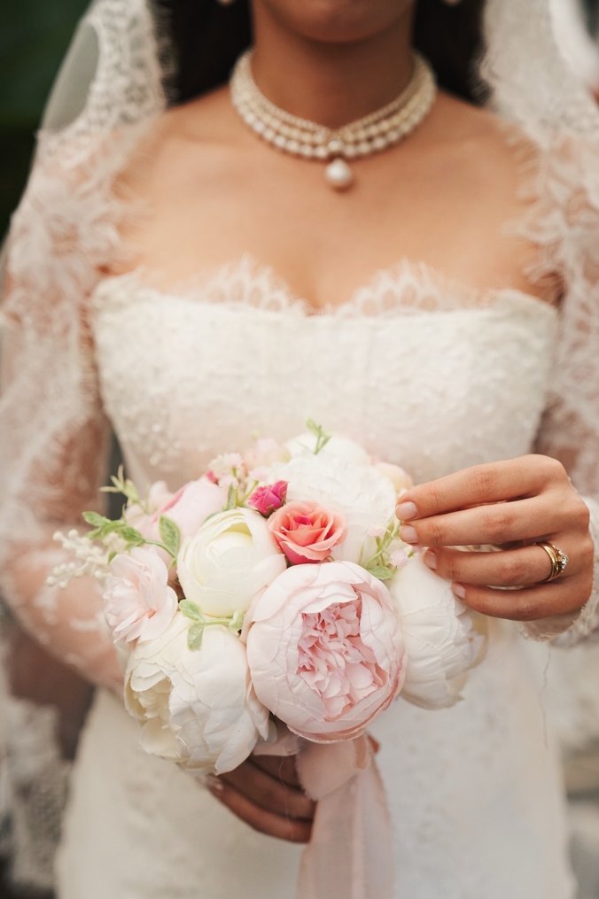açık pembe ve beyaz çiçeklerden oluşan bu gelin buketi, klasik zarafet ve Paris bohem tarzını yansıtıyor.
