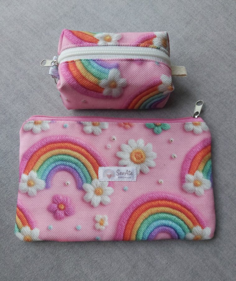 Yumuşak kumaştan, gökkuşağı ve çiçek desenli renkli makyaj çantası. Fermuarlı kapanışa sahip, rahat ve bohem tarzda 2'li organizer çanta seti. Ölçüler: 20x12,5cm/11x6x4,5cm Ürün tamamen el emeğidir. Sınırlı sayıda satışa sunulmuştur. 30°'de hassas yıkama önerilir. Leke çıkarıcı ve çamaşır suyu kullanılmamalıdır.