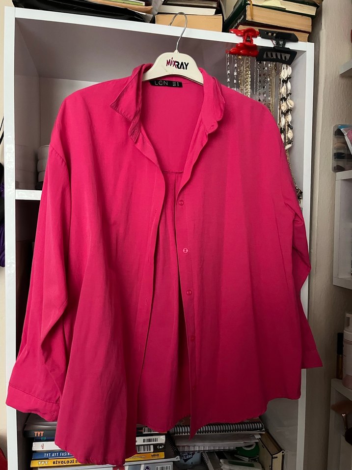 MIRAY markalı, düğmeli, keten kumaştan yapılmış, pembe, parlak ve düz tasarımlı, uzun kollu, normal boy keten gömlek.