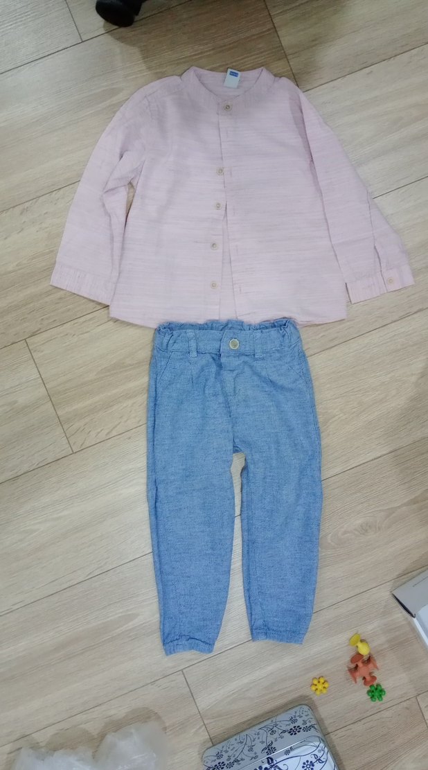 Pastel pembe düğmeli uzun kollu keten gömlek ve açık mavi pantolondan oluşan bebek takımı. Gömlek yakası kesik ve desensiz, rahat normcore tarzında.