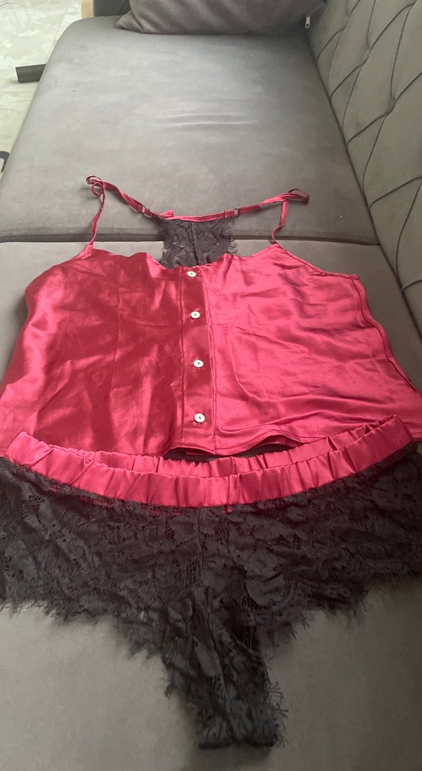 Kadınlar için pembe, gotik tarzda, ip askılı, kısa mini uzunlukta ve bol kesim pijama takımı. Düğmeli ve dantel detaylıdır.