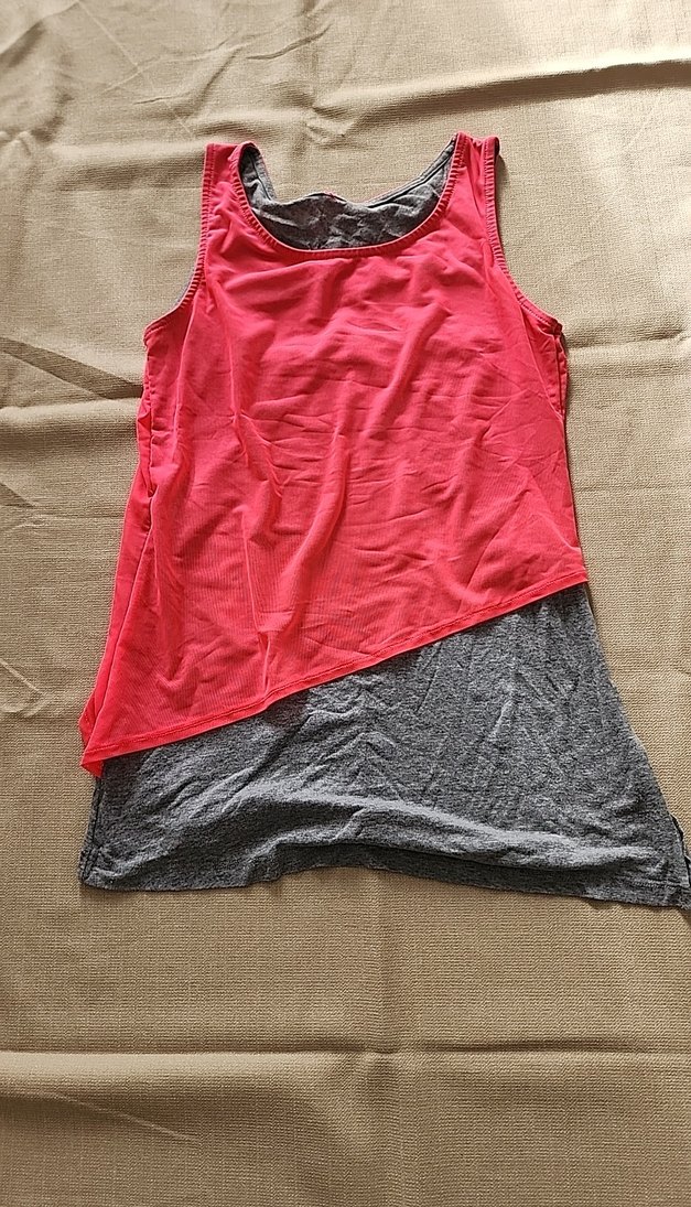Kadınlar içn Pembe drapeli asimetrik üst, gri taban üzerinde sıkı kesim ve yumuşak sentetik kumaştan. Yuvarlak yakalı, midi boyda, spor ve sokak stiline uygun. ♀️