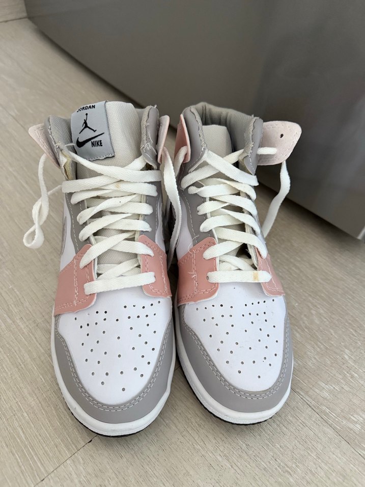Pembe ve gri kauçuk malzemeden, bağcıklı ve yüksek topuklu kadın spor ayakkabısı, sokak stili ve spor kullanıma uygun.