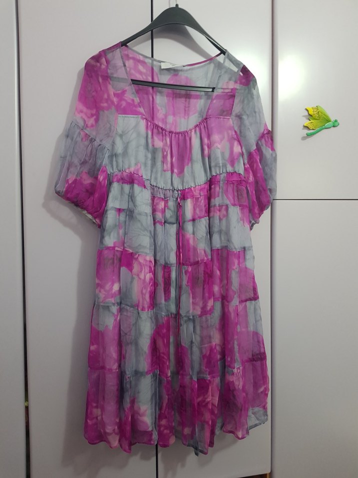Pembe-gri bağlama desenli, salaş kesim midi elbise. İpek gibi kumaştan, fırfırlı detaylı, askılı ve straplez yakalı, günlük kullanım için uygundur.