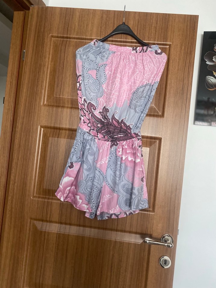 Pembe ve gri bağlama desenli, straplez, bol kesim mini kadın tulumu, bohem tarz için uygun.göğüs 40 cm 50 kadar esniyor boy 78 cm