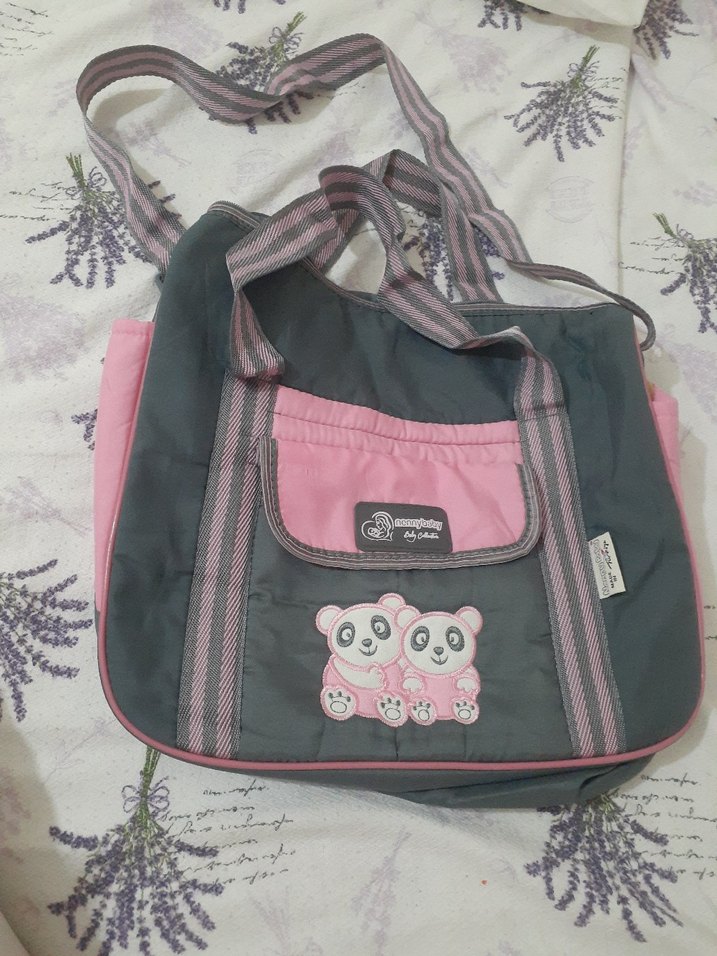Pembe ve gri renkte, baskılı panda desenli bebek çantası. Çoklu askıları ve küçük eşyalar için ön cepleri bulunur.