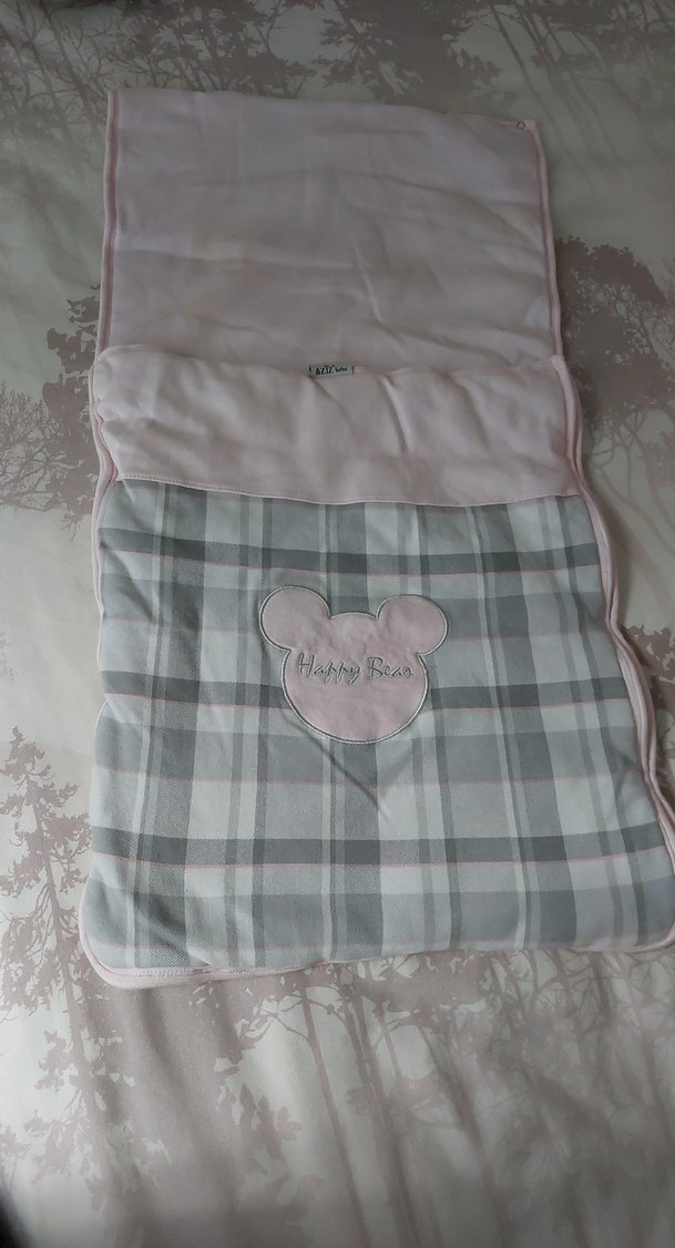 Yumuşak ve sıcak kumaştan, gri-pembe kareli baskılı ve nakışlı ayıcık desenli çocuk uyku aksesuarı.