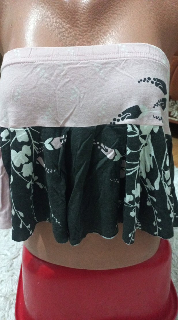 Sentetik kumaştan, pembe ve gri baskılı, volan detaylı, bol kesim mini etek, bohem tarzda rahat bir seçenek sunar.