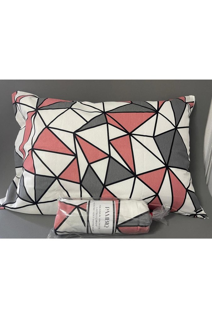 Pembe ve gri tonlarda geometrik desenli yazılı yastık kılıfı,ve lastikli çarşaf seti yumuşak dokusu ve modern tasarımıyla öne çıkar. ️