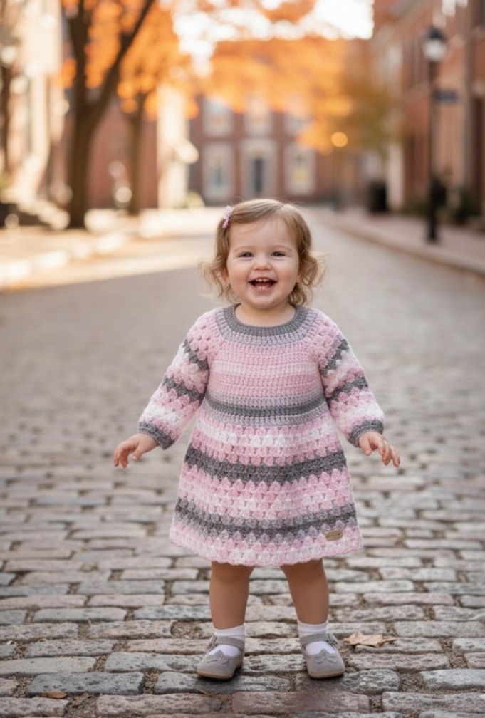 Pembe ve gri batik desenli, el örgüsü, bol kesim ve uzun kollu, yuvarlak yaka kız çocuk elbisesi. Bohem ve retro tarzı yansıtıyor.