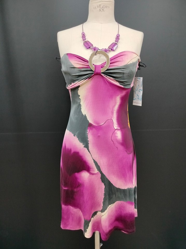Pembe ve gri batik desenli, straplez ve drapeli, kısa ve vücuda oturan elbise, partiler için uygundur.