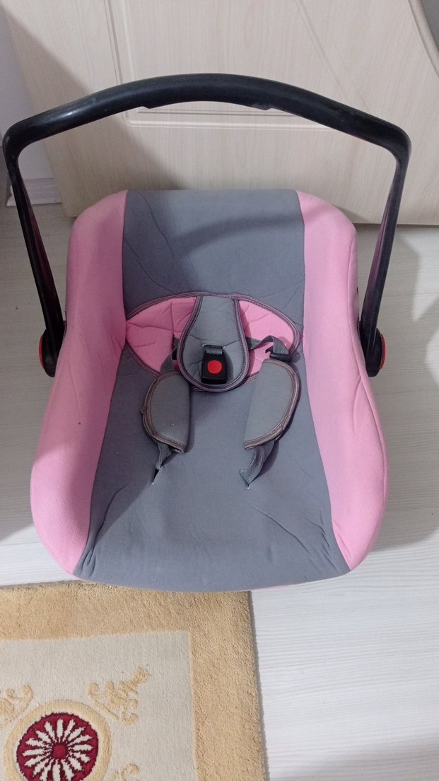 Pembe ve gri renkli bebek ama kucağı güvenli kemer sistemi ve taşıma sapına sahiptir. Seyahat sırasında bebekler için rahat destek sağlar.