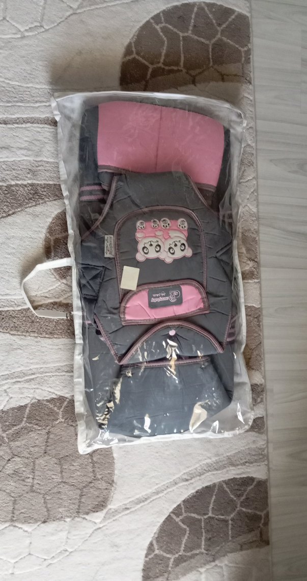 Pembe ve gri renklerde, ayarlanabilir askılı ve yumuşak dolgulu bebek taşıyıcıdır. Önünde sevimli panda desenleri bulunur.