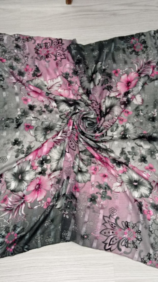 Pembe ve gri tonlarda, bohem tarzda, dökümlü tasarıma sahip kadın şalı. Yumuşak sentetik kumaştan üretilmiştir, moda öncülerine uygundur.