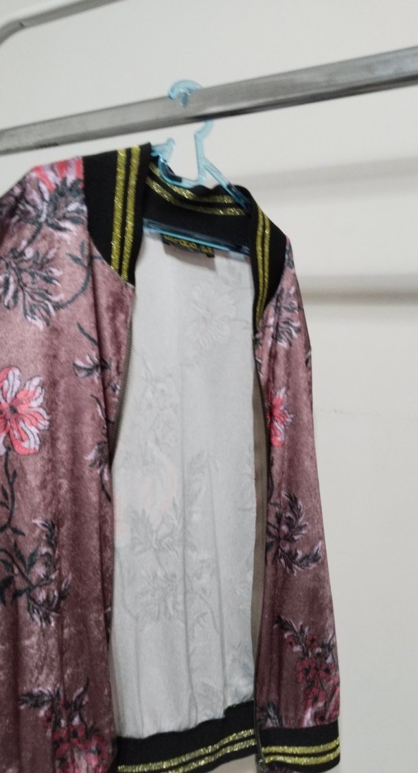 Yumuşak sentetik kumaştan üretilmiş, pembe gri çiçek desenli, uzun ve bol kesim, V yakalı, drapeli kadın kimono. Bohem tarzına uygun.