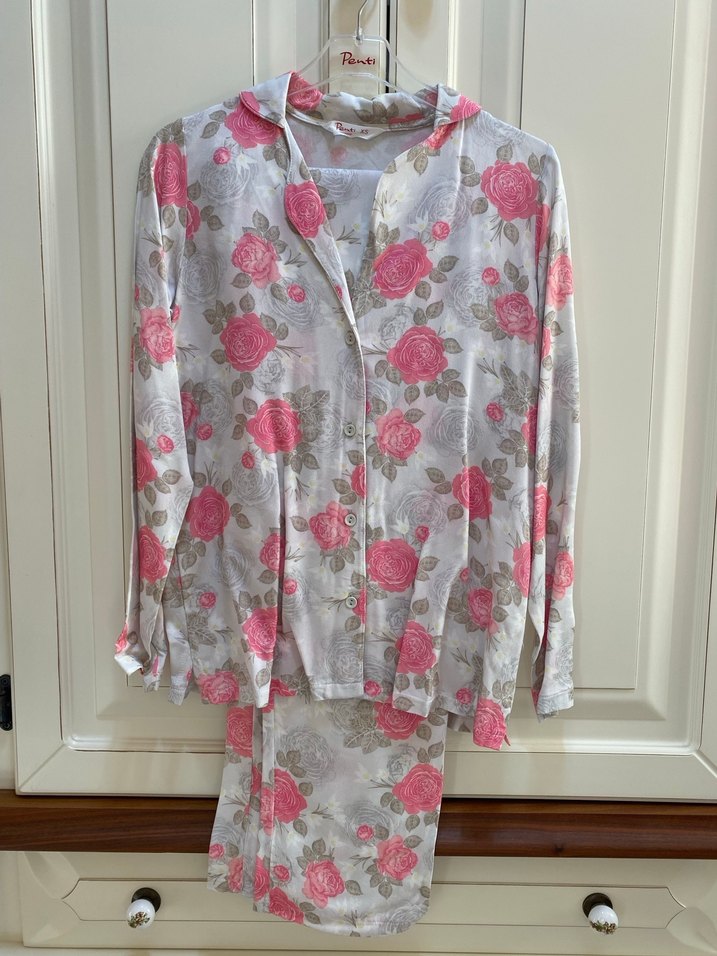 Pembe ve gri çiçek desenli, uzun kollu, bol kesim kadın pijama takımı. Midi boyda, yumuşak kumaştan rahat kullanım sağlar.