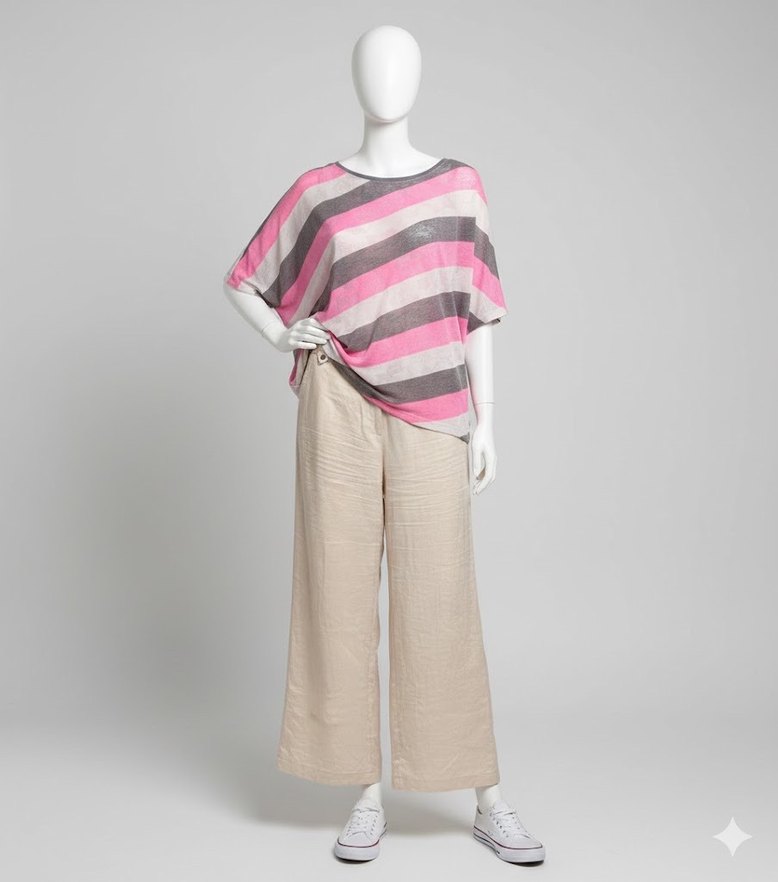 Pembe ve gri çizgili, bol kesim bluz. Tekne yaka ve askılı kollarıyla, yumuşak sentetik kumaştan, günlük kullanım için drapeli tasarım.