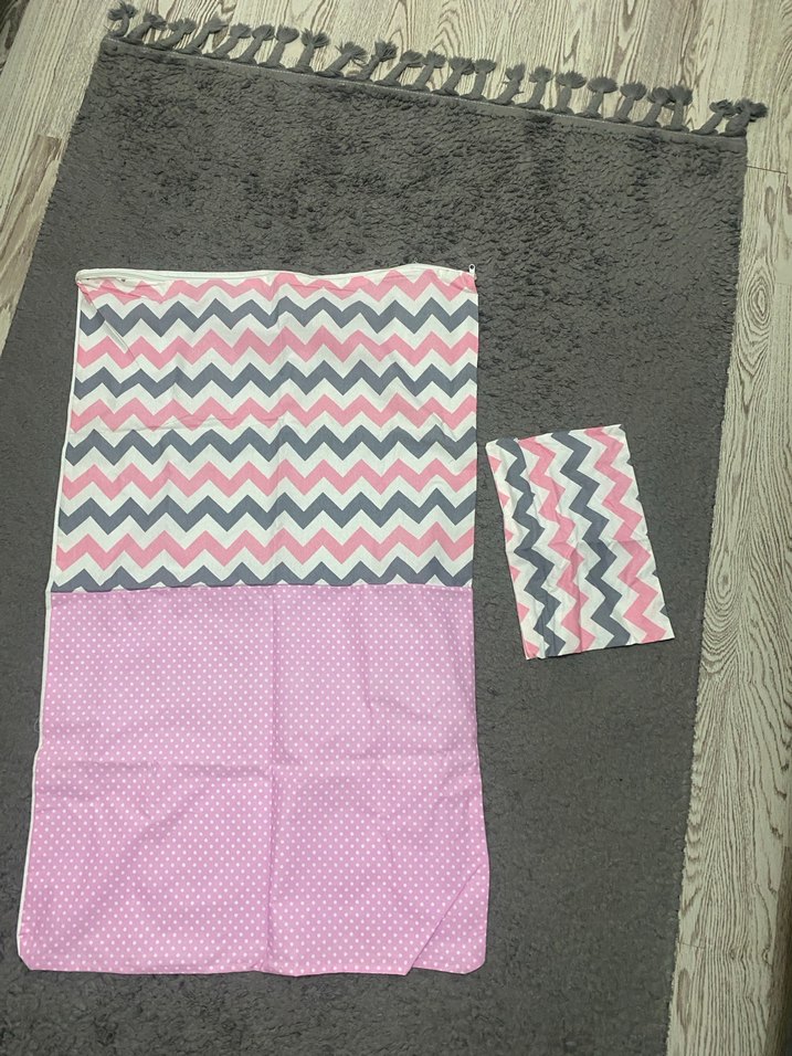 Pembe ve gri renklerde zigzag ve puantiye desenli sentetik kumaştan çocuk uyku seti. Yorgan kılıfı fermuarlı ve uyumlu yastık kılıfı içerir.Hiç kullanılmadı temizidr