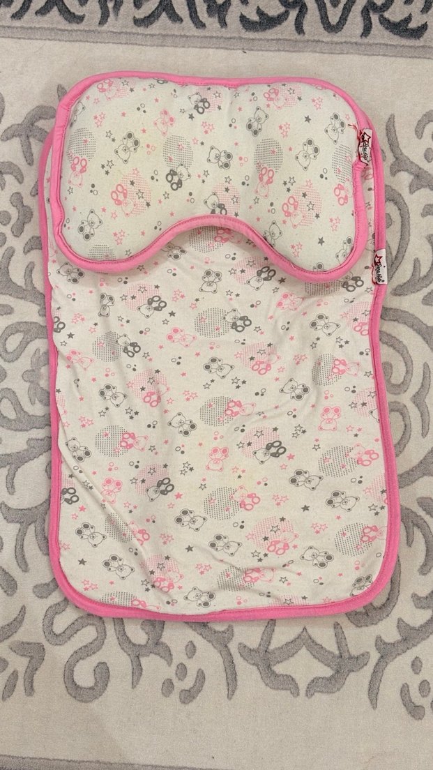 Pembe ve gri tonlarda baskılı desenli, yumuşak ve sıcak kumaştan yapılmış çocuk uyku seti, örtü ve uyku maskesi içerir.