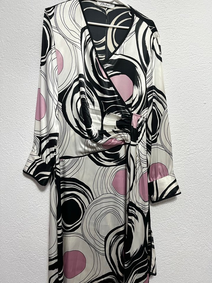 Pembe ve gri tonlarda, Paris tarzı desenli, uzun ve bol kesim kadın elbise , askılı kollu tasarıma sahiptir. Şifon gibi ama tiril tiril elbise