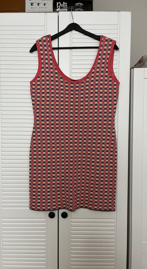 Kırmızı ve gri kareli triko, kolsuz, tekne yaka, midi boy, vücuda oturan kesim, avant-garde sokak stili elbise.