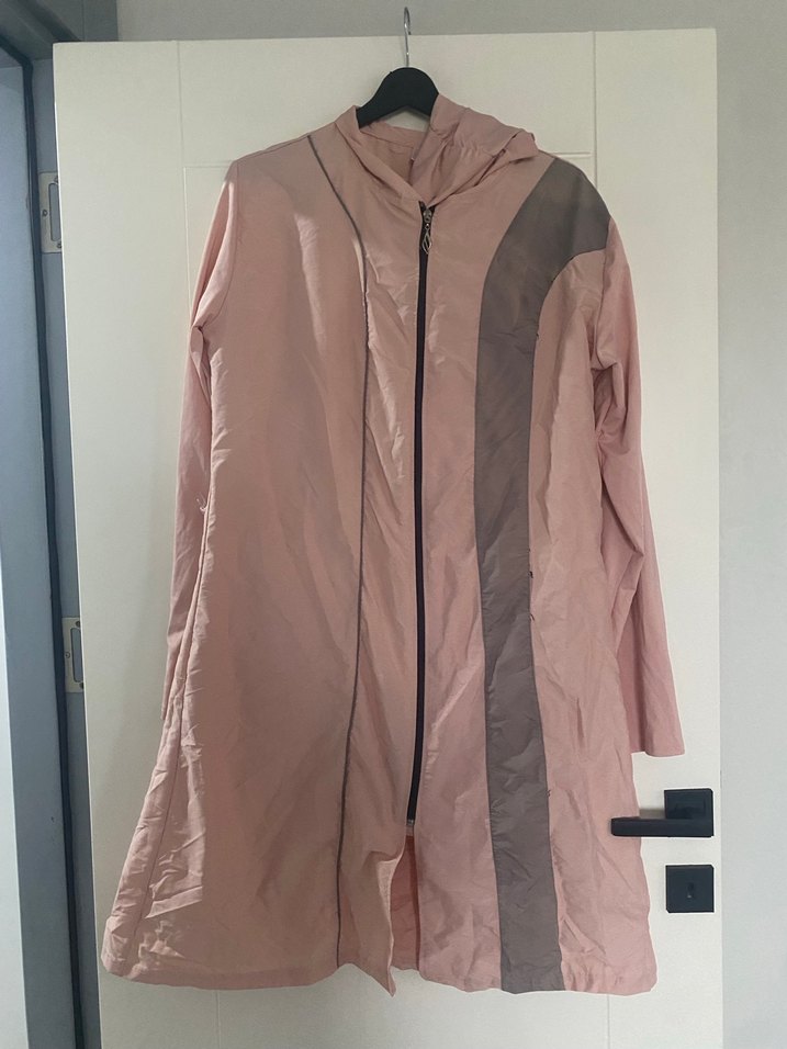 Pembe renkte, gri kontrast şeritli, bol kesim ve drapeli uzun hasema Uzun kollu, yakalı ve fermuarlı, sentetik kumaştan alt kısmı tayt tarzında iç sütyen kısmı ve bonesi mevcut