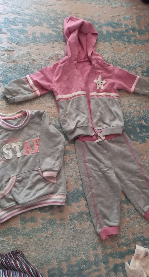 Uzun kollu, nakışlı ve örgü dokulu pembe gri bebek kız takımı. Kapüşonlu ceket, 'STAR' nakışlı sweatshirt ve eşleşen pantolon içerir.