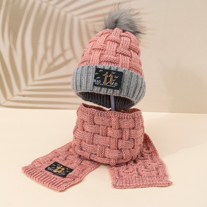 Nakış detaylı, pembe ve gri renklerde örgü bere ve uyumlu atkı seti. Yumuşak örgü kumaş, trend sokak stili için uygun. çocuk için