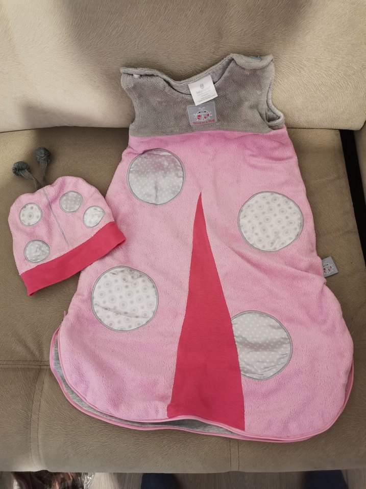 Pembe ve gri renklerde, uğurböceği desenli, yumuşak ve sıcak kumaştan yapılmış bebek uyku tulumu ve uyumlu şapka seti. 0-6 ay, sorunu yok.
