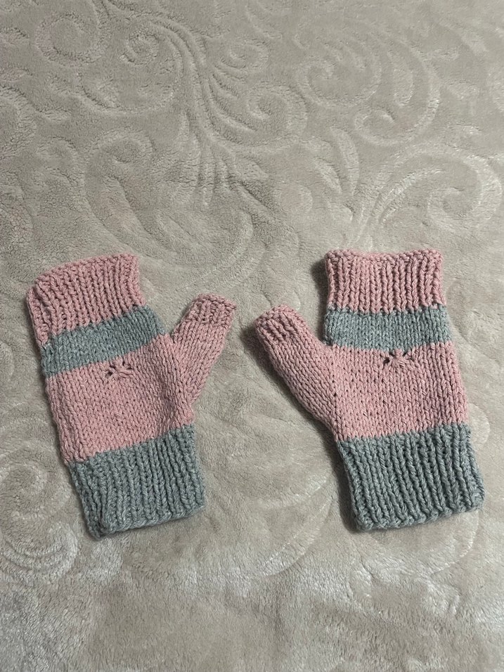 Yumuşak örgüden yapılmış pembe ve gri renkli parmaksız örgü eldivenler, rahat ve nostaljik bir tarz sunar.