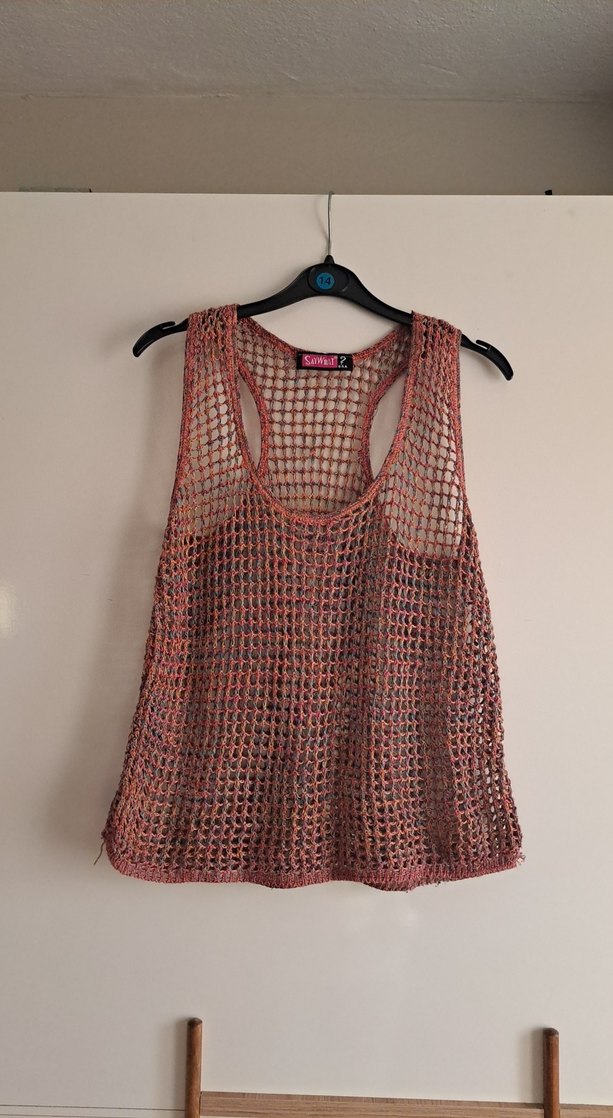Pembe ve gri tonlarda tie-dye desenli, örme kumaştan, salaş kesim kadın atlet. Kolsuz ve yuvarlak yaka, günlük kullanıma uygun.